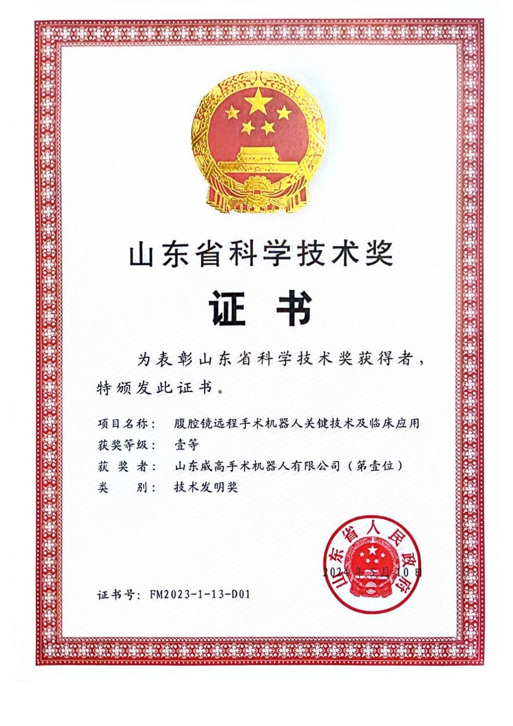 5月13日,山东省人民政府网站发布《山东省人民政府关于2023年度山东省科学技术奖励的决定》,经省科学技术奖励评审委员会评审、省科学技术奖励委员会审定和省科技厅审核,授予由山东威高手术机器人有限公司作为第一完成单位参与的“腹腔镜远程手术机器人关键技术及临床应用”成果为省技术发明奖一等奖,这也是威海市唯一的一等奖企业。